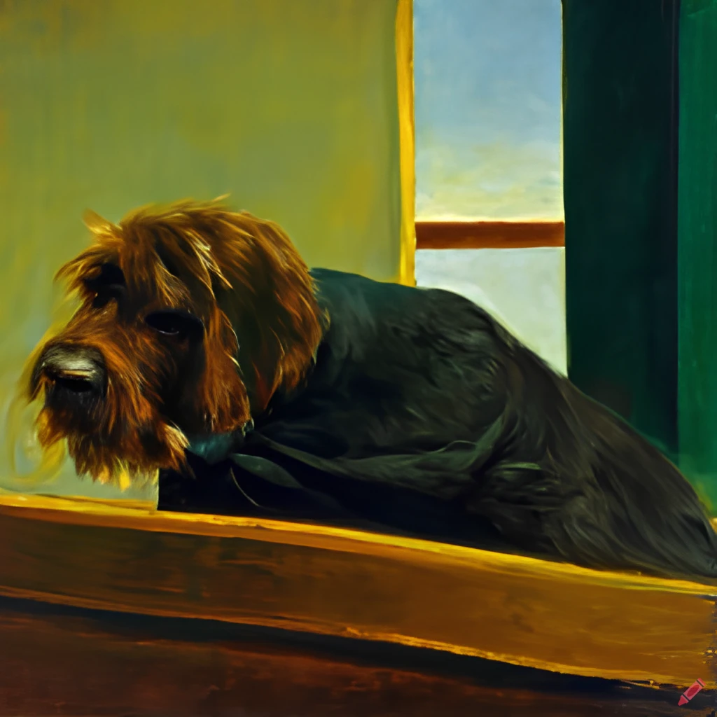 An Edward Hopper painting of Bowie, the dog that sleeps in a chair behind me while I work, as envisioned by Craiyon.
